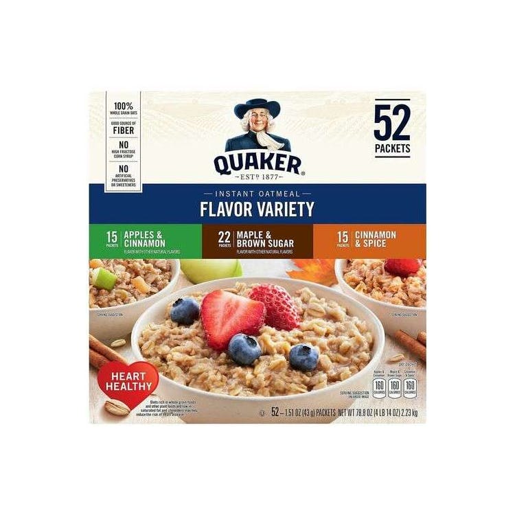 Quaker Instant Oatmeal Variety Pack offers Maple & Brown Sugar Apples & Cinnamon and Cinnamon & Spice flavors. Made with whole grain oats for a heart-healthy quick breakfast.